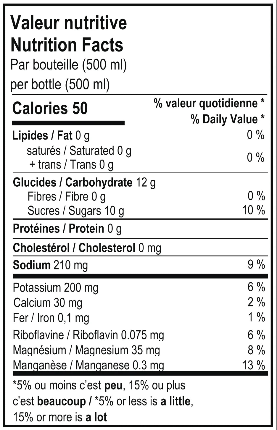 Water, Pure Quebec Maple Syrup, Citric Acid, Sodium Citrate, Potassium Citrate, Magnesium Citrate, Natural Color, Natural Flavor. The same clean formula, in a ready-to-drink format.
